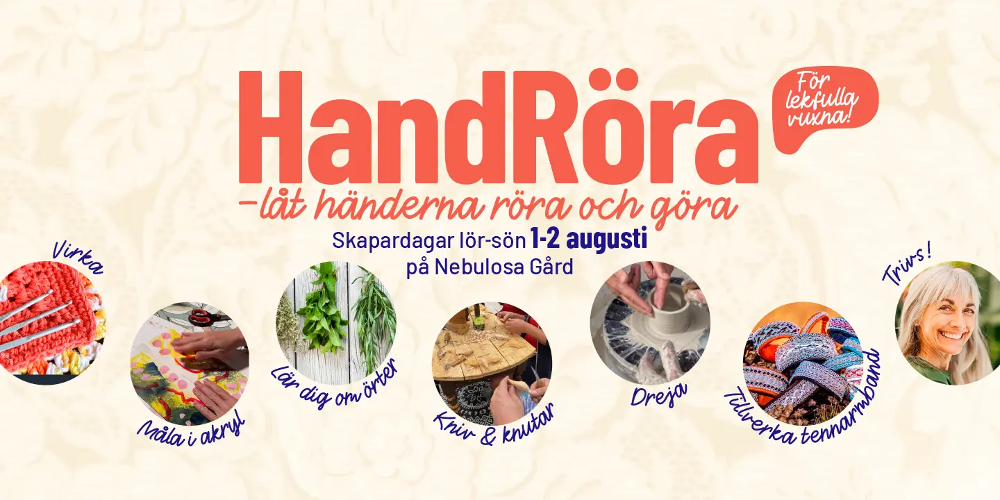 Målgruppen för HandRöra är lekfulla vuxna som vill ge sig själv en skapardag/skapardagar och glöm inte att ta kläder som tål att få en fläck eller två :)